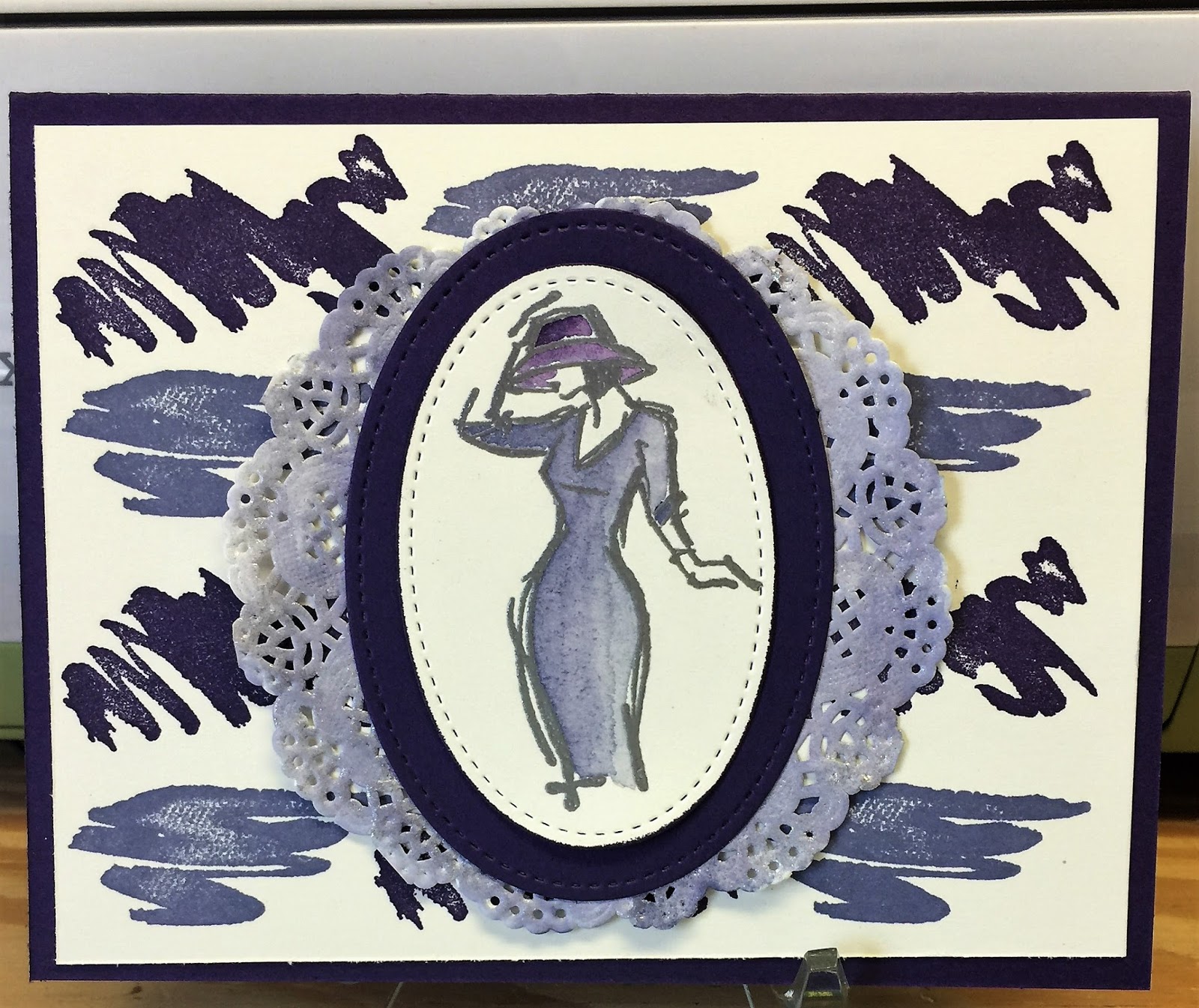 This picture does not do this card justice. I used the 3rd largest Stitched Shaped Framelit to cut out Very Vanilla.  I embossed the lady in Silver and then used the Aqua painters and the inks Elegant Eggplant, and Wisteria Wonder to color her in.  I used the Squiggle stamps for the background and used Elegant Eggplant and Wisteria Wonder.  I used Elegant Eggplant card base and cut it out of the largest Stitched Shaped Framelit.  I then took one of the Delicate White Dollies and used the Aqua Painters to color it with the Elegant Eggplant ink, I then used the Clear Wink of Stella Brush on it.  I wish you could see how shiny it was.  I made this for a customer who’s favorite color is purple and she just purchased this Stamp Set.  This is my favorite part is to make handmade cards for my customers.