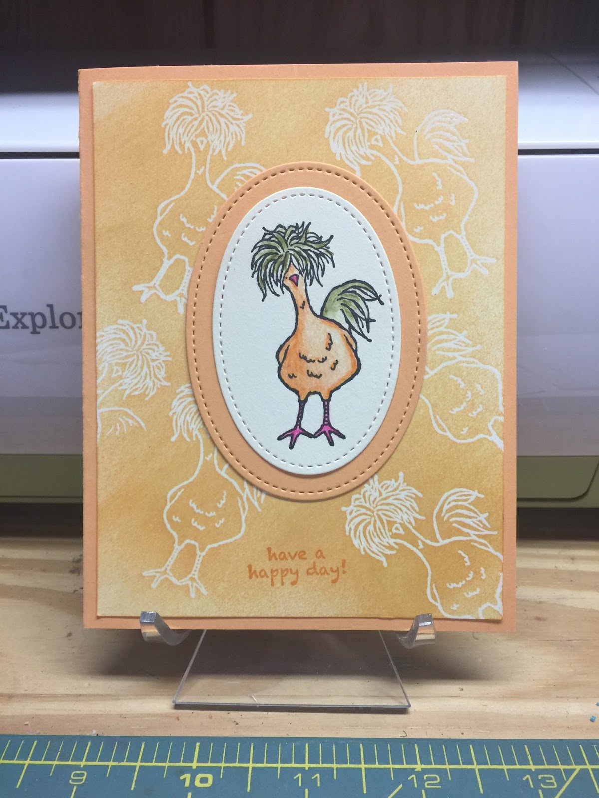 I used Peekaboo Peach cardstock for the base and the larger oval. I used Whisper White for the background and used the Versa mark ink pad to stamp out my chicken randomly and then used the clear emboss powder.  I then used the Sponge Brayers on the back ground.  I used the inks Peekaboo Peach, Pumpkin Pie and Daffodil Delight with the Brayer. I took a paper towel and cleaned the chickens off with any remaining ink on them.  I used the Stitched Shaped Framelits two largest Ovals the largest was cut with Peekaboo Peach and the smaller of the two was cut with Whisper White.  I then used the Watercolor Pencils with the Aqua Painters (which is my new favorite right now).